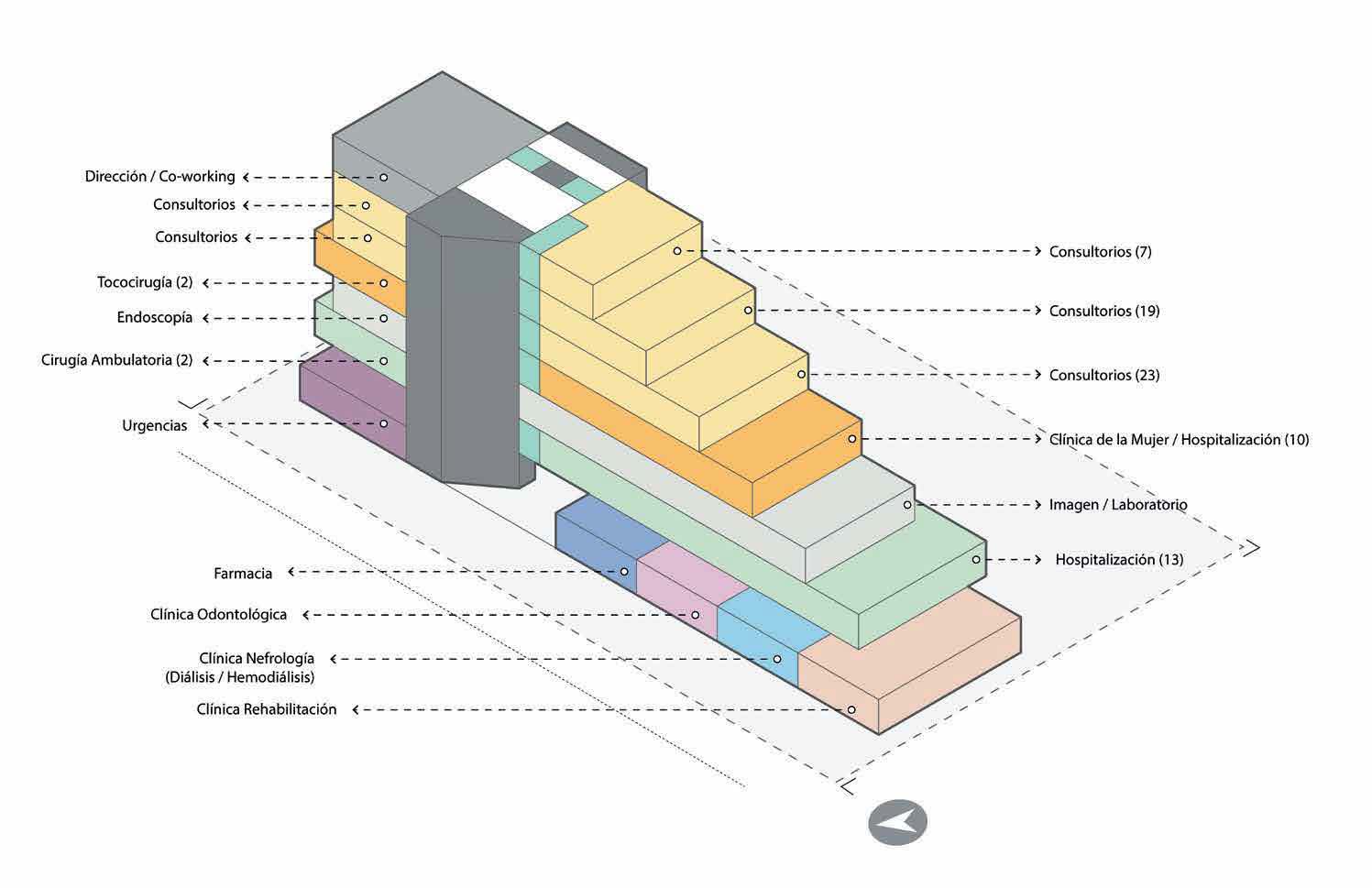El esquema compositivo responde a la optimización de la ubicación del predio teniendo un acceso principal peatonal y vehicular el cual vestibula los accesos al área de urgencias y los servicios del hospital y encamina a la parte posterior del hospital en donde se encuentra el estacionamiento. A su vez en la parte frontal cuenta con estacionamiento y acceso a estas áreas desde la vialidad principal.